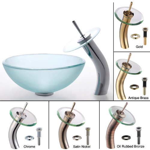 Finish:Satin Nickel, Glass Options:Frosted Glass Add a touch of elegance to your bathroom with a glass sink combo from Kraus. Stylish glass sink and matching waterfall faucet will complement any bathroom decor Installing Kraus combo is an ideal home improvement project Sink: Glass sink is constructed from solid tempered glass Sink features polished glass interior and exterior Designed for above counter installation with standard US plumbing connections Solid brass umbrella pop-up drain and mounting ring are included in the same finish as the faucet Diameter: 14' Height: 5.5' Glass thickness: 0.5' (12 mm) Mounting ring adds 0.5' 1.75' standard drain opening Limited Lifetime Warranty Certified and Listed by UPC, cUPC, CSA, IAPMO, ANSI and SCC Faucet: Waterfall faucet is constructed from solid brass High-quality ceramic cartridge Single-hole, top-mount installation Single lever water and temperature control Standard US plumbing connections All mo