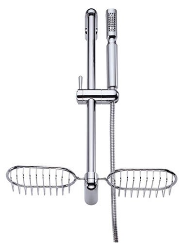 D464603 Features: -9'' showerstick personal shower.-Twin oversized wire baskets.-Mounts to your shower arm (shower arm not included).-Wall mount.-Backflow prevention. Options: -Available in the following finishes: chrome. Dimensions: -24'' wall bar.-72'' hose.-Overall dimensions: 25'' H x 13.4'' W x 3.74'' D.
