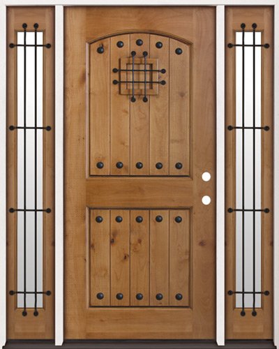 Factory finished knotty alder hardwood. Includes v-groove, clavos, operable speakeasy, and grille. Sidelites includes grille over clear glass. Pre-hung in ready to paint 4-9/16" primed jambs, with brickmould. Left-hand inswing. Double-bore with 2-3/8" backset . Energy efficient: Insulated glass, Fully weatherstripped, Thermal break threshold. Premium construction for increased durability: Engineered stiles and rails that resist warping or twisting, Engineered split resistant panels. Door is 36" x 80" nominal size. Unit size is 64-3/4" x 81-1/2". Fits 65-1/4" x 82" rough opening. Please read "Wood Door Requirements & Care" under seller details before purchasing.
