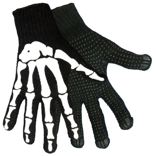 Global Glove S60SKD Skelton patter dotted string knit. String knit skelton pattern black glove PVC dots on Palm, Size: men. Color: black with white skelton design. Skelton patern, black palm with PVC dots. cotton/poly shell. General purpose. Used as a liner in any type of glove that is used in cooler conditions. Can be used with leather drivers, dipped gloves, or chemical handling safety gloves. PVC dots for superior dexterity.