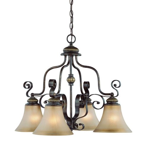 Finish:Century Bronze, Light Bulb:(4)60w A19 Med F Incand The Kingsley family is a regal series of lighting available in many sizes. The flat banded heavy metal scrolling incorporated with metal tubular arms of each chandelier makes for a true design statement. The glass shading is soft bell shape with hand brushed light amber tones allowing for a statement of class and styling while still being functional as a primary light source. The bronze base coat is a hand applied in a multi step process and then highlighted with subtle gold accents on the decorative cast metal design elements. The Kingsley series offers exceptional height throughout the family and making it a perfect match for the high ceilings in today's new homes.